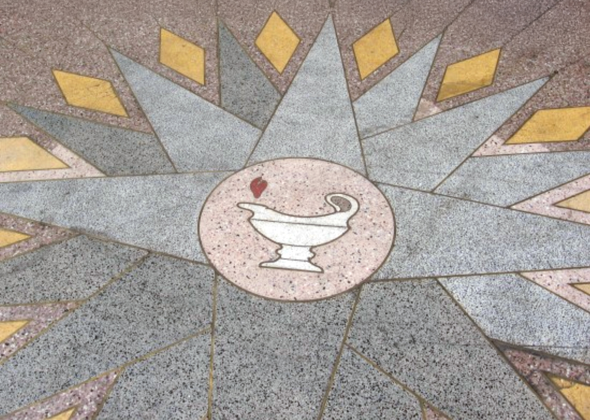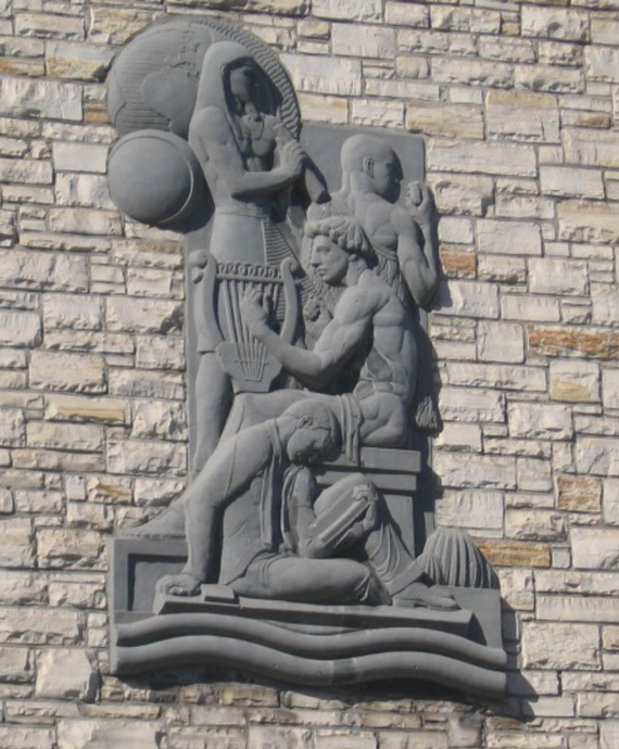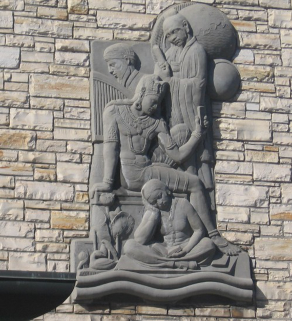 Renowned San Diego artist Donal Hord created a pair of sculptural reliefs on the theme of "literature," depicting historic figures with books in 1953. Architect Carleton Winslow Sr.’s terrazzo entryway, featuring emblems like an ancient lamp of learning, a sailing ship, and the California and San Diego seals embody the city’s civic, cultural, and artistic legacy. These integral, site-specific artworks express regional pride and love of learning.