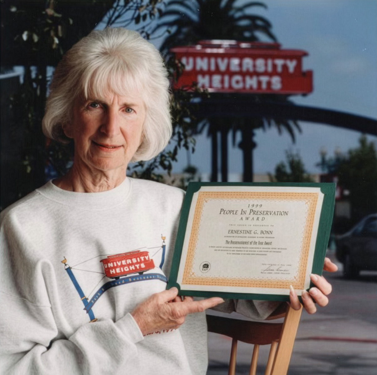 Her leadership extended into nearly every facet of neighborhood life. Ernie served multiple terms on both the North Park Planning Committee and Uptown Planners, helping guide thoughtful growth in a community uniquely situated between two planning areas. She used her considerable financial skills to help form the University Heights Parking District and Maintenance Assessment District, helped bring Old Trolley Barn Park to life, and played a key role in establishing the Willie Serrano Joint Use Field at Birney Elementary School. She was also instrumental in realizing the iconic University Heights Sign, crowned by a red trolley car and spanning Park Boulevard.