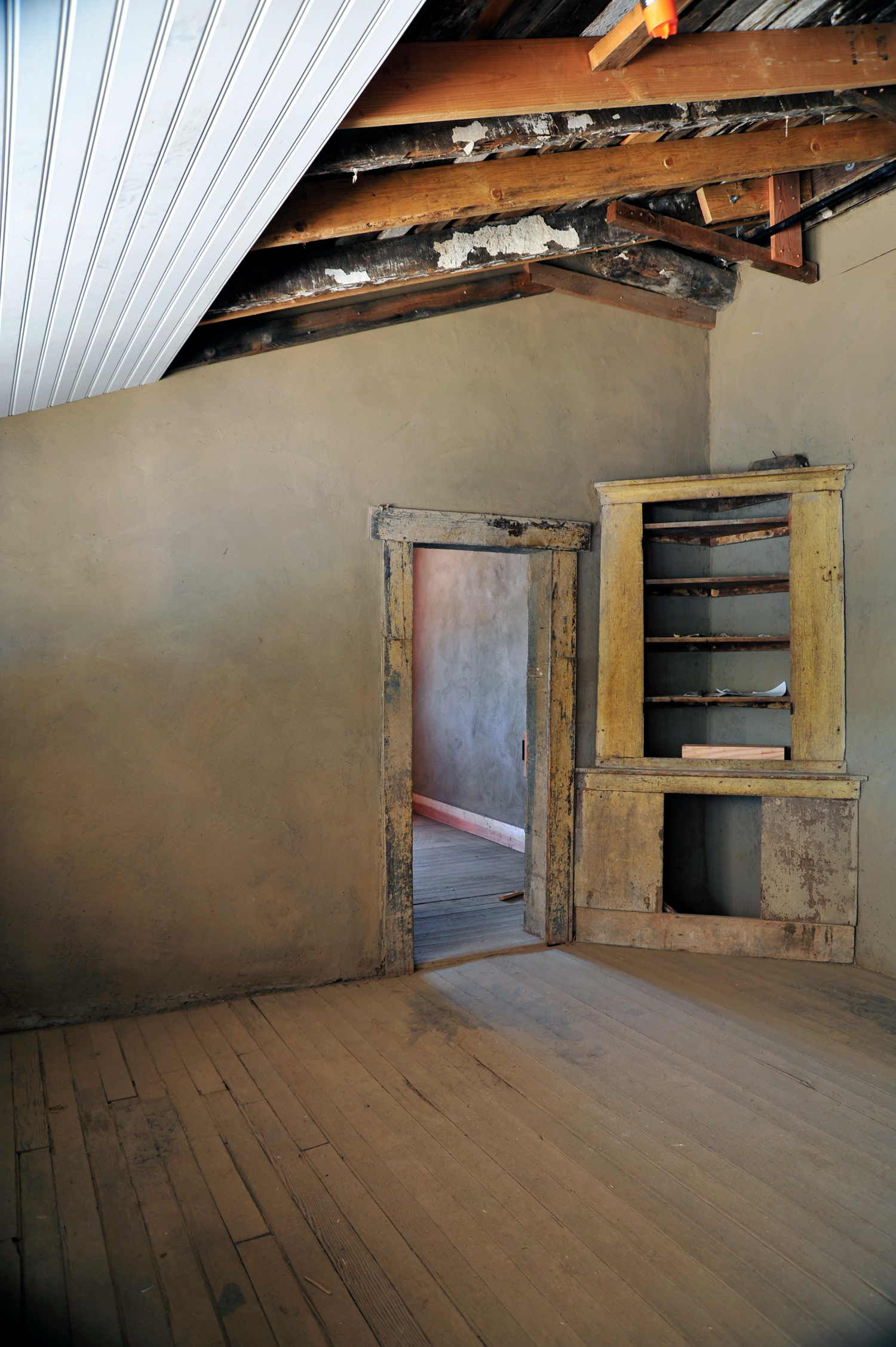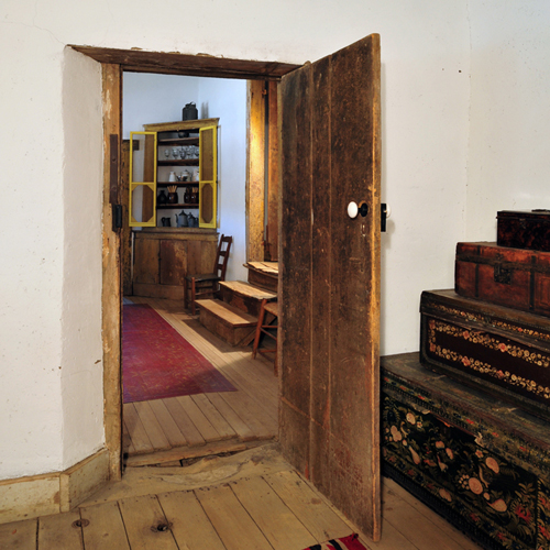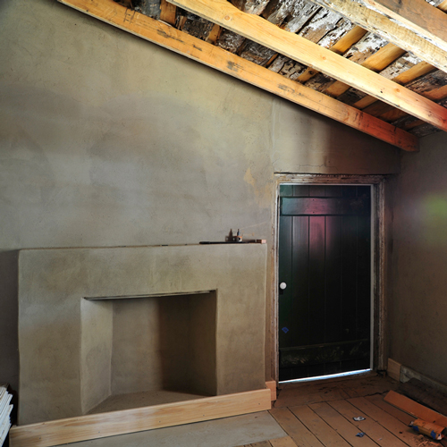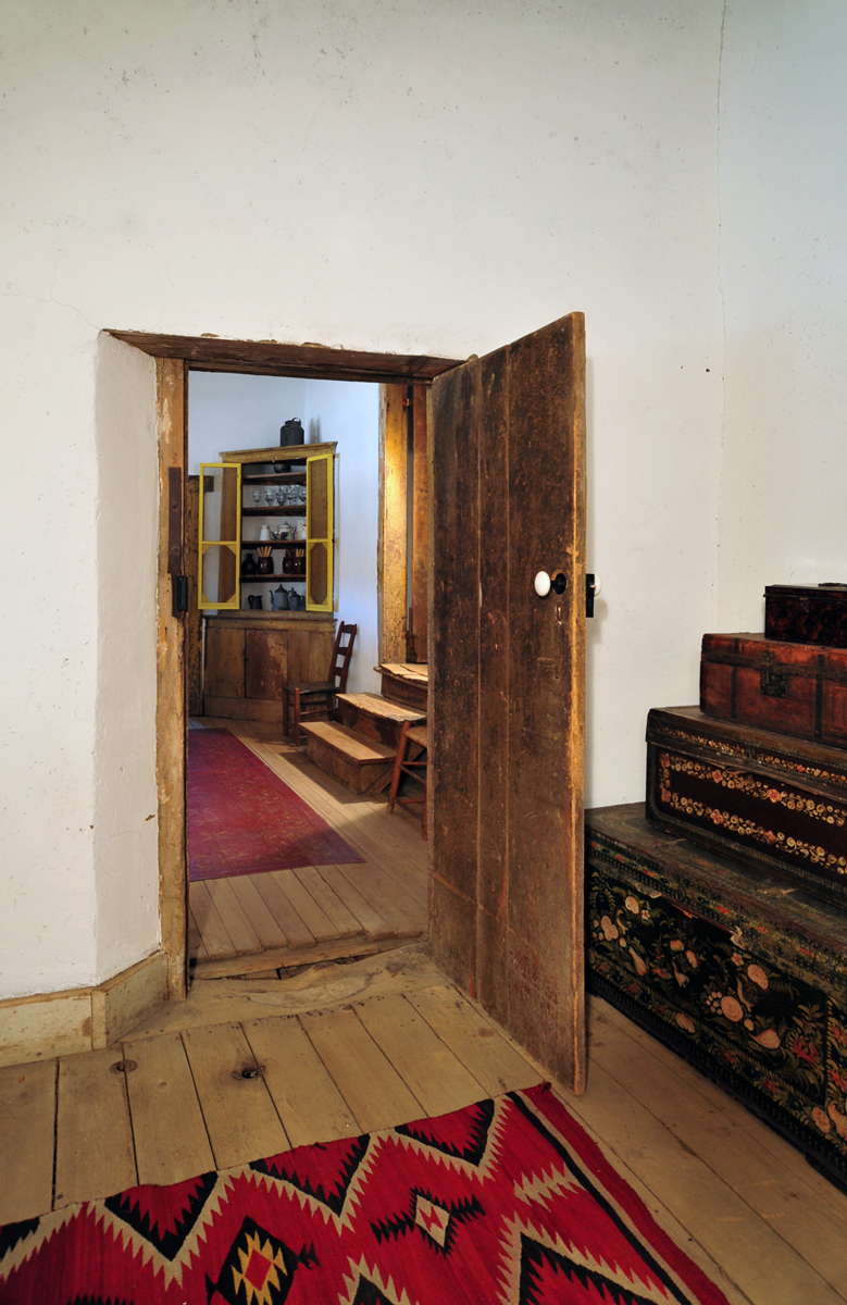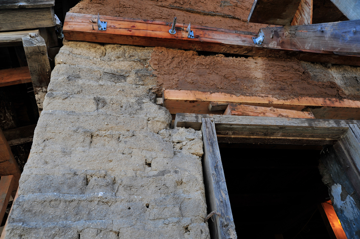 Remarkably, the the original fireplace mantel, doors, woodwork, vigas (wooden ceiling beams), and even interior paint surfaces had survived. Where walls, roof sections, or adobe bricks had disappeared, the team rebuilt them carefully, always prioritizing preservation of original materials—a requirement for maintaining National Historic Landmark status.