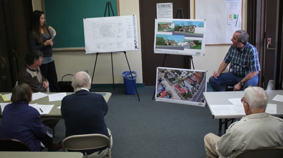 Applicants Sarah Horton and Tim Golba explain the details of the Caplan Residence project to DPR members. Both photos by María José Durán |