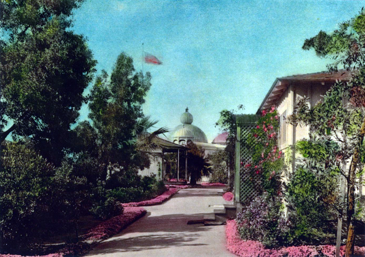 Hand-colored image of a historic Lomaland cottage. While not the Corbin cottage, it is an example of the same type during their heyday. |