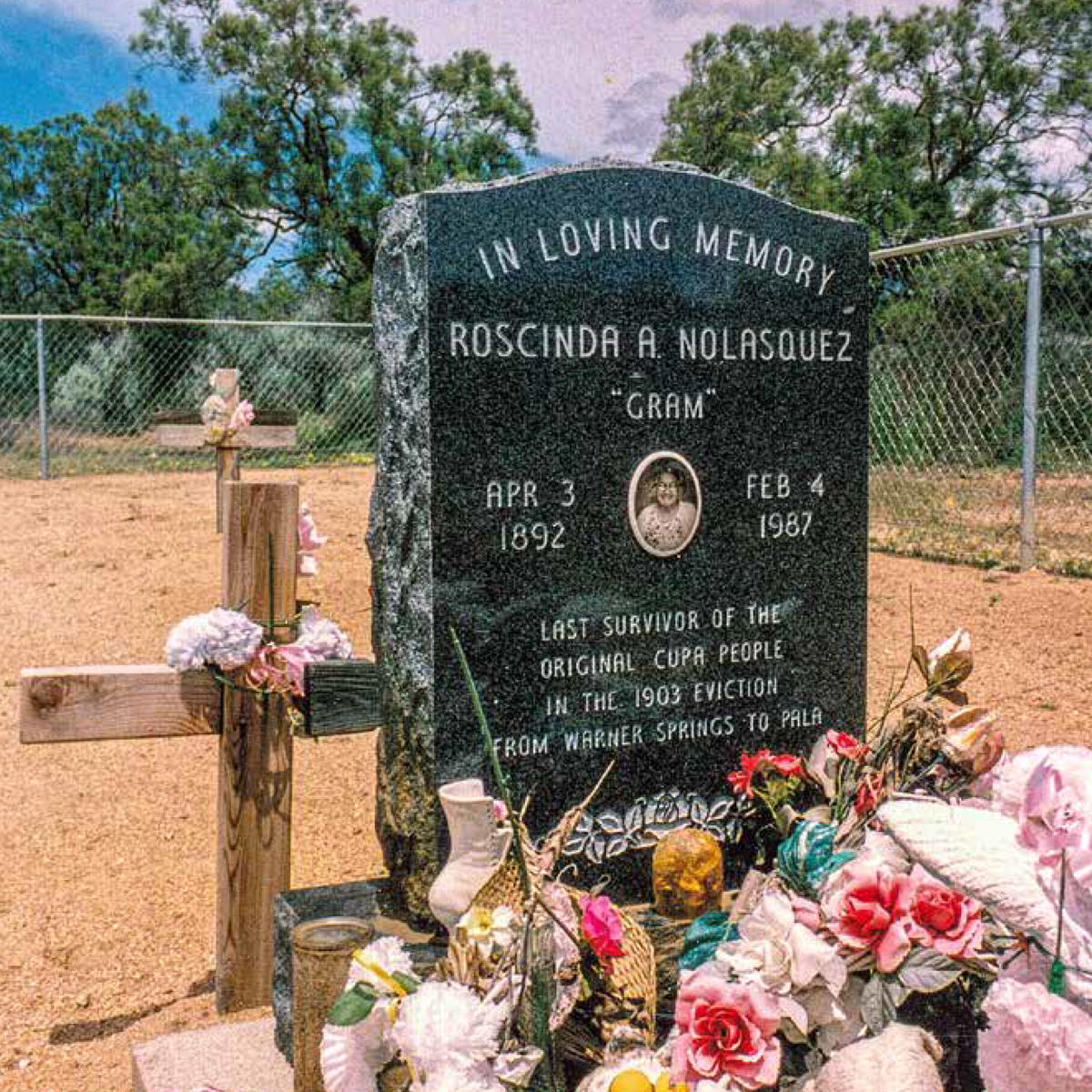 Roscinda A. Nolásquez was the last Cupeño survivor of the tribe’s 1903 “Trail of Tears” removal from Warner Springs. This photo of her grave marker, located in the cemetery behind the 1830 Chapel of St. Francis of Assisi, appeared on the cover of The Journal of San Diego History, Winter 2018. |