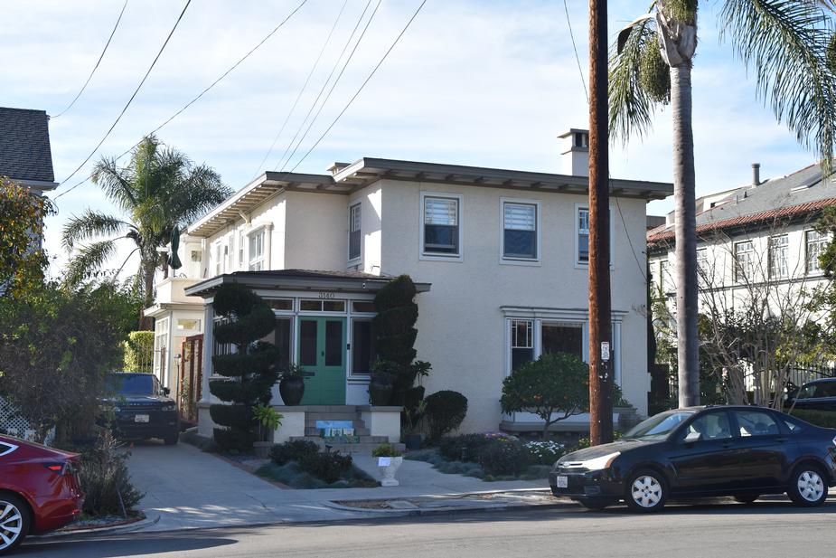 3140 2nd Avenue in Uptown is a 1916 Prairie style home called the Ellen Thompson/Walter Douglas House. It meets HRB Criteria C, for architecture, and D, for a Master Architect. The designation includes several interior elements and the detached garage. It embodies and retains character-defining features of the Prairie style with Italianate influences. Other stylistic elements from its 1916 construction: an asymmetrical primary facade, a flat roof with wide overhanging eaves, brackets, heavy sand stucco cladding, a projecting one-story enclosed front entry with columns, a focal window with partial-width columns and an integrated flower box, and original wood-framed fenestration in a variety of styles, including several fixed stained-glass windows. The original interior stairs and stair railing, stained-glass window at the base of the stair, living room built-in cabinets and dining room buffet are included in the designation and are consistent with the home’s Prairie style and contribute to its significance. The house was also designated under HRB Criterion D as being a notable work of Master Architect Walter Douglas, a prominent and accomplished architect who designed many quality structures in San Diego and the Colorado Springs area, some of which are listed on the Colorado State and National Registers of Historic Places. The house is a significant example of Douglas’ custom residential work in the Prairie style. In designating this house, the board simultaneously approved Douglas’s Master Architect status. |
