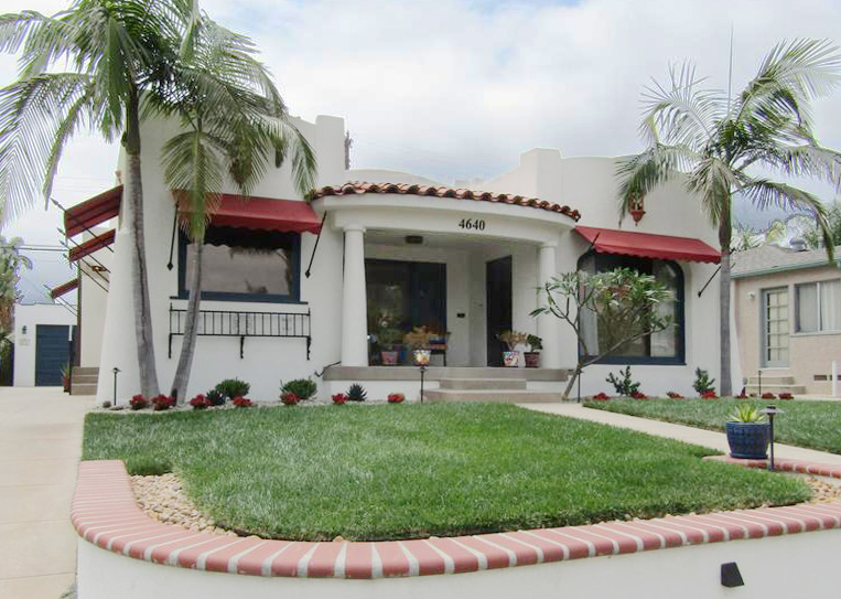 4640 West Talmadge Drive in Kensington is a 1926 house built in the Mission Revival style. Named the Charles and Geraldine Zurn Spec House, it is designated under HRB Criterion C, for its architecture. The house embodies the style’s distinctive characteristics and retains defining features with integrity. Among these are a flat roof with arched parapets and crenelations, a clay tile visor roof, a clay tile roof covered porch, Tuscan style porch supports, oversized corner bollards, a battered stucco chimney, wood-framed French doors, and several fenestration styles: deeply inset arched focal windows, a tripartite window, and double-hung windows, with walls finished in a light-sand stucco. The designation excludes the detached, modified garage/ADU structure. |