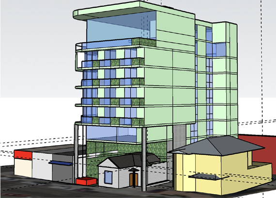 Left The Ordway House (c. 1888) in Little Italy is one of the few remaining buildings from downtown San Diego’s oldest development and today stands with three others of its era on State Street. Courtesy the California Historical Resources Inventory Database (CHRID) Right The historic Ordway House, if the San Diego Planning Commission approves, is destined for an unorthodox new life on State Street. A new eight-story, mixed-use project called Celine plans to use the cottage and its rooftop for commercial purposes, surrounded by 52 high-rise rental units. Courtesy economic feasibility report by ZLD Consulting |