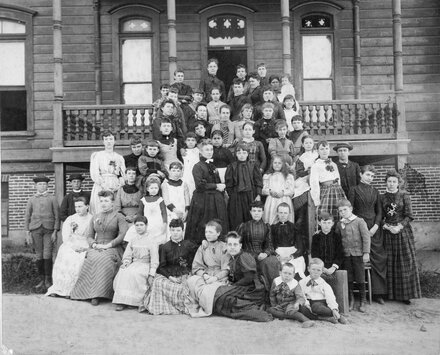 Mary Marston (in the first row of standing people, she is sixth from left, wearing her school pinafore; to her left is a teacher in a black dress) and her brother, Arthur (seated, right front, in a white shirt), among their teachers and fellow pupils at the staircase leading to the front veranda of the Southwest Institute, c. 1890. |