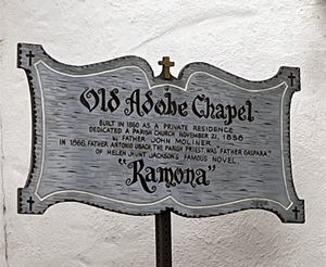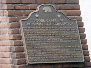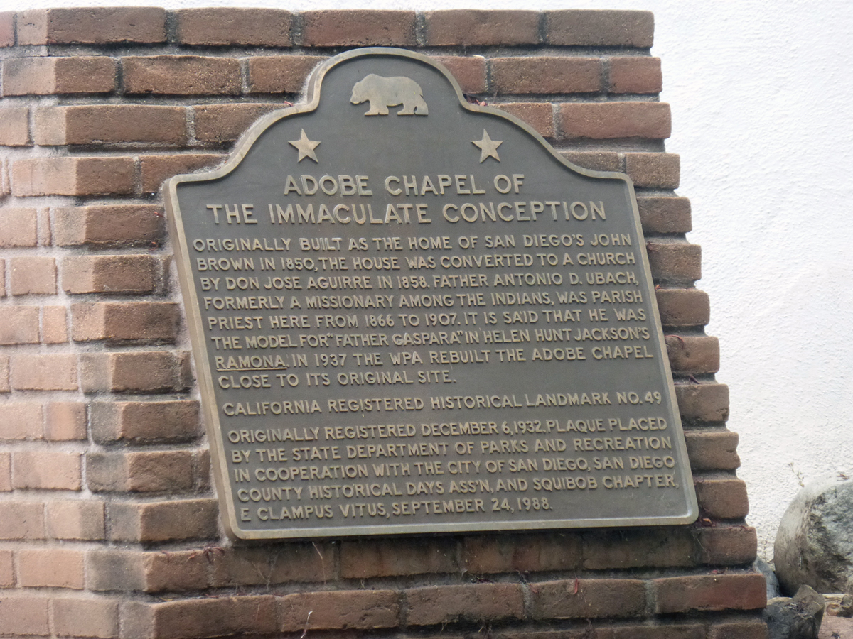 Originally built as the home of San Diego's John Brown in 1850, the house was converted to a church by Don José Aguirre in 1858. Father Antonio D. Ubach, formerly a missionary among the Indians, was parish priest here from 1866 to 1907. It is said that he was the model for “Father Gaspara” in Helen Hunt Jackson's Ramona. In 1937 the WPA rebuilt the adobe chapel close to its original site.