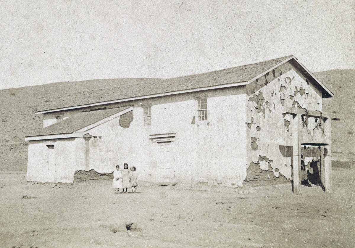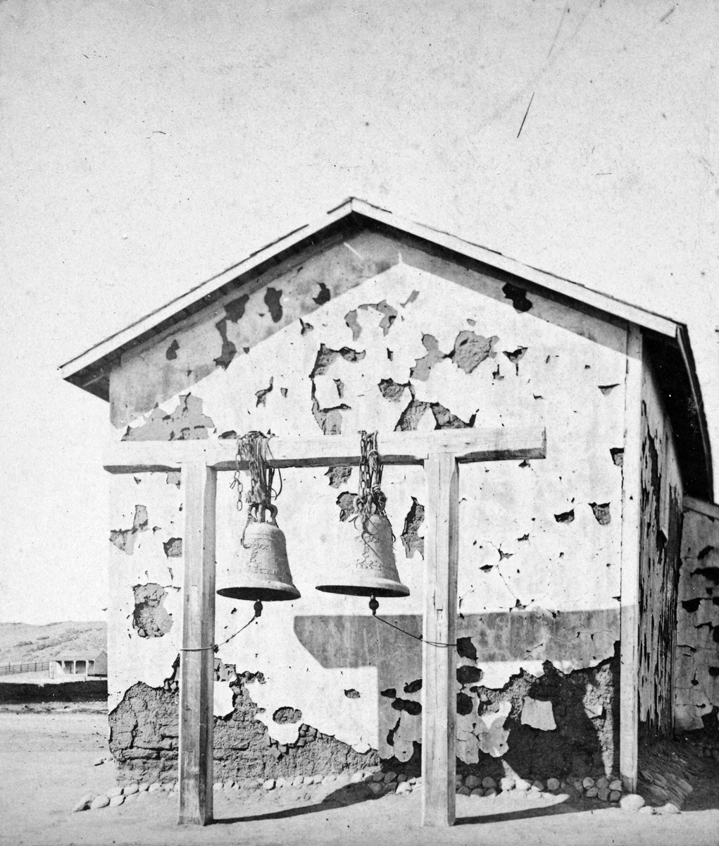 Local children standing in front of the chapel’s northwest entry, pre-1870s. Notice the deleterious condition of its exterior walls and the pair of suspended mission bells. SOHO collection
