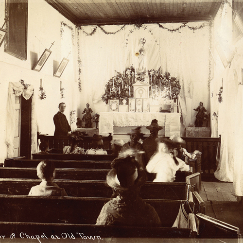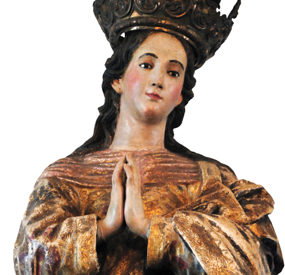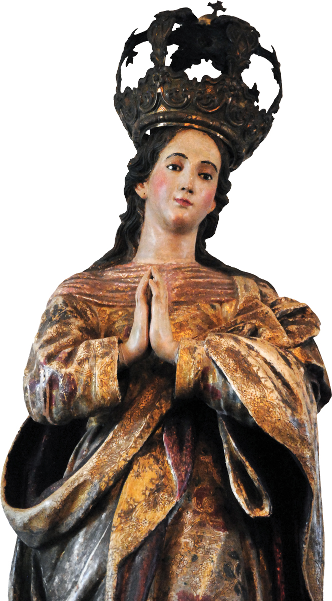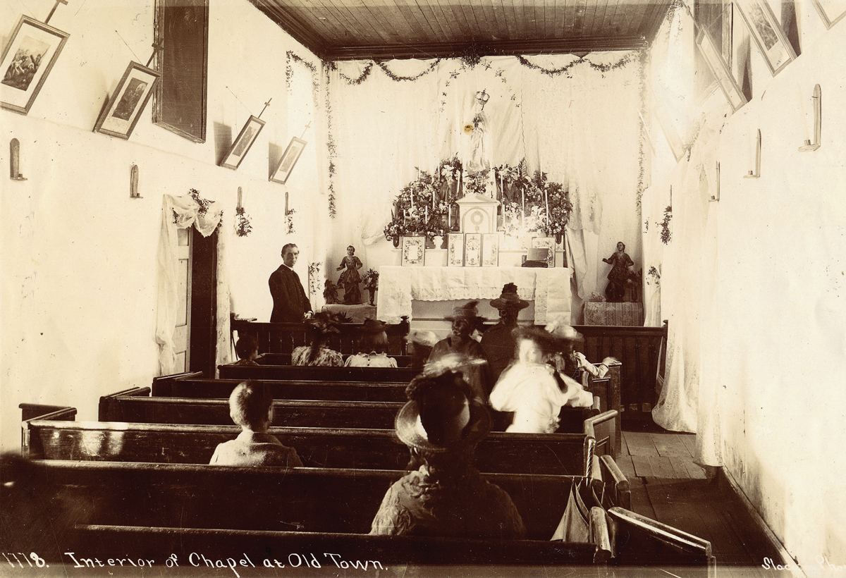 Left Clapboard siding protects the chapel’s adobe walls, post-1870. Notice that the twin hanging mission bells are missing. One was reportedly returned to the reconstructed San Diego mission in 1931. Photo courtesy California State Parks, Office of Historic Preservation Center The interior of the Adobe Chapel of the Immaculate Conception, c. 1890, with the four-foot-tall, crowned statue of Nuestra Señora de la Concepción rising above the altar tabernacle. Both objects were originally sacred elements of the former Spanish presidial chapel as early as 1770. Here, we see paintings of the Last Judgement, and the Stations of the Cross, as well as statues of twin archangels, all from the mission or the presidio. Courtesy Bruce Coons Collection Right The 18th-century wood and gesso statue of the Nuestra Señora de la Concepción, San Diego’s Roman Catholic patroness, was moved from the former presidio chapel into a makeshift chapel in the nearby Casa de Estudillo. Installed in the Adobe Chapel in 1858, the statue remained there until 1919, when it was relocated into the new Church of the Immaculate Conception on the corner of San Diego Avenue and Twiggs Street. Sometime after 1945, it was moved again to the Mission San Luis Rey Museum, but returned on short-term loan to the Adobe Chapel in 2019, at SOHO’s request, to celebrate the city’s 250th year. |