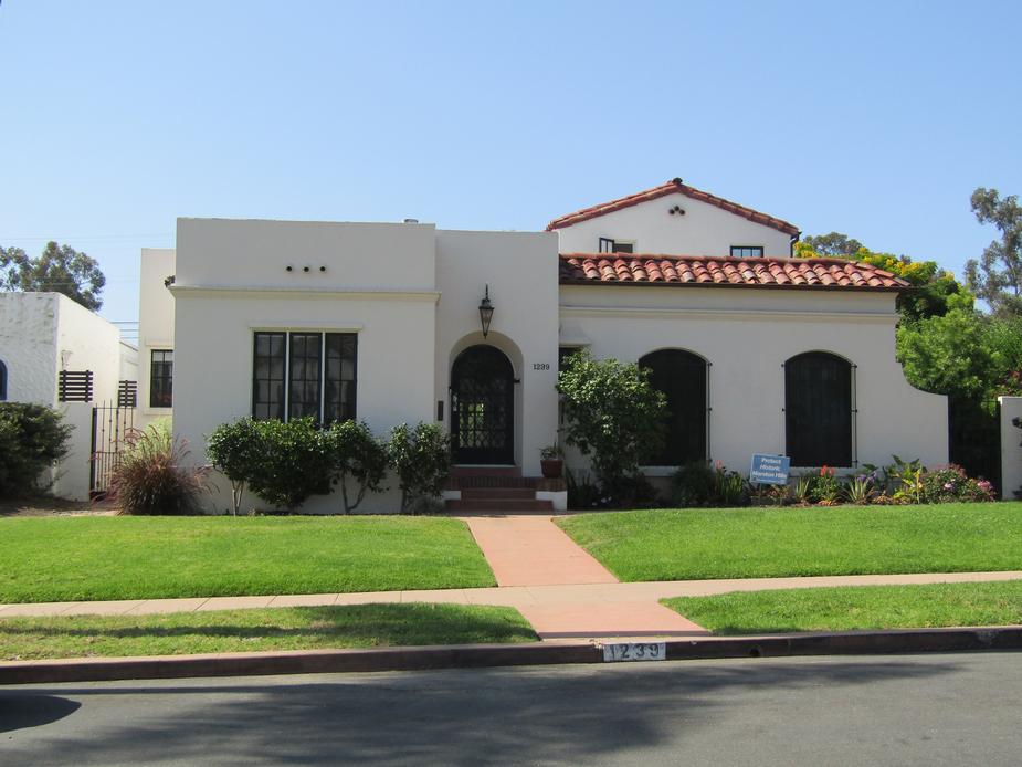 1239 Myrtle Avenue in Hillcrest is the John and Kate Bardsley/A.M. Southard House from 1925. It meets HRB Criteria C (for architecture) and D (for a master builder). The Spanish Colonial Revival style home retains integrity and embodies the style with its asymmetrical facade; recessed arched primary entrance; stucco exterior; varied roof forms, including a flat roof with parapet and low-pitched shed tile roof; arched focal windows; and multi-light wood-framed fenestration. Through this designation, proposed Master Builder A.M. Southard is now officially on the City’s master builder list. The house is a notable work of this prolific and accomplished builder who constructed many quality residences in revival styles in the San Diego area in the 1920s and 1930s. He ran the A.M. Southard Company and the Southard Steel Structures Company. The designation excludes the 1978 second story addition and the 1979 kitchen addition. |