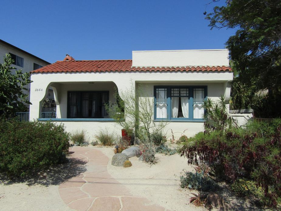 3560 32nd Street in North Park is a Spanish Eclectic style home named the George Carter Spec House #1. The 1927 residence warrants designation for its architecture under HRB Criterion C. It features an asymmetrical facade, stucco cladding, varied roof forms with tile roofing and little eave overhang, stucco chimney, arched porch wall design, and fenestration consisting mainly of wood-framed windows in various light patterns and operations. The designation excludes the accessory dwelling unit and the garage. |