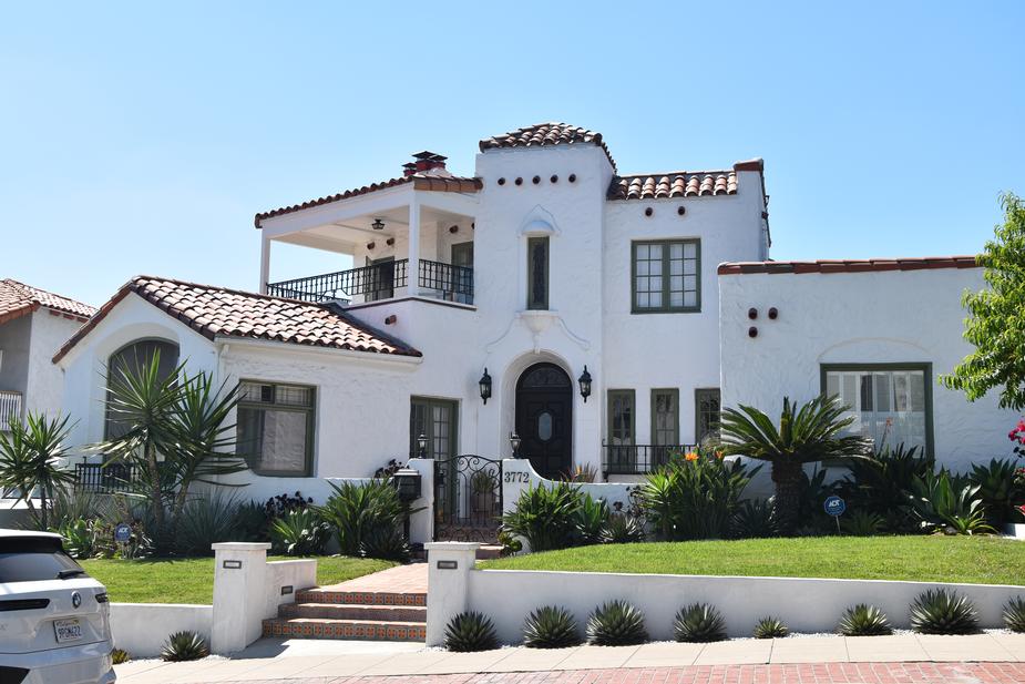 3030 Alcott Street in the Peninsula Community is named the Laura and Harold Conklin House, for the couple who built it as their residence in 1937, and is designated under HRB Criterion C for its Spanish Colonial Revival style architecture. It retains integrity and embodies design elements of the style, including a low-pitched hipped roof with single barrel clay tile, wide eaves with exposed rafter tails, sand stucco siding with belt courses, wood-framed multi-light casement and fixed windows, wood-framed multi-light French doors, diamond pane casement windows, stucco grilles, an open second-story porch with wood posts and beams, battered wing walls, decorative corbels, and a stucco chimney. |