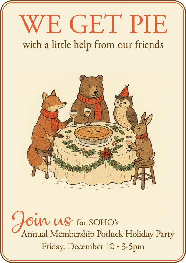 If you’ve been thinking about becoming a SOHO member, now’s the perfect time. Each December, SOHO members gather for one of our most beloved traditions—the Annual Members’s Potluck Party. Join us on Friday, December 12, 2025 for a warm and festive late afternoon filled with friendship, laughter, and members’s favorite recipes and goodies.