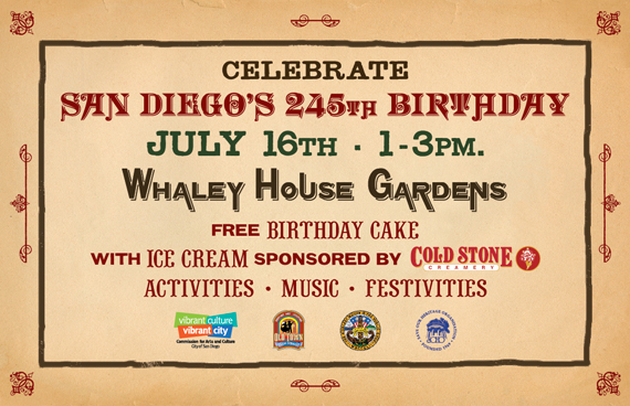 Come celebrate San Diego's 245th birthday in the gardens of the Whaley House Museum in Old Town, San Diego, on Wednesday July 16 from 1 to 3pm. Emceed by Old Town San Diego Chamber of Commerce president Fred Grand, there will be remarks by San Diego City Council president Todd Gloria and County Supervisor Ron Roberts. Sponsored in part by Old Town businesses, there will be free birthday cake and ice cream, music, dancing, and much camaraderie. It will be a heartfelt celebration, free to all with the goal of each ensuing year garnering interest and involvement from the entire city gearing up for a huge event for the city's 250th year in 2019 with the expectation that the whole city to take part on that day.