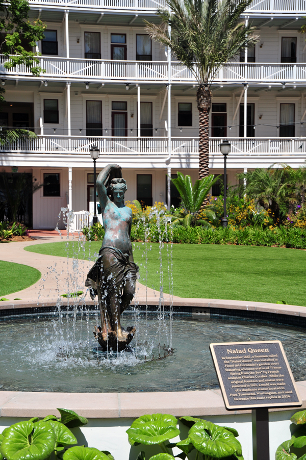 The Hotel del Coronado courtyard sculptural centerpiece is a replica of the original bronze “Naiad Queen” statue cast from a duplicate found in Washington state. Courtesy David Marshall, AIA |