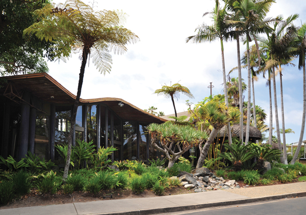 The property stood out when it opened in June 1962, as it does now, for its fusion of Modernist ideals with playful, even theatrical, design. It remains a fully immersive experience in a landscape of thatched roofs, lava rock walls, water features, exotic flora, and sculptural elements, including a kinetic wind sculpture of a turtle.